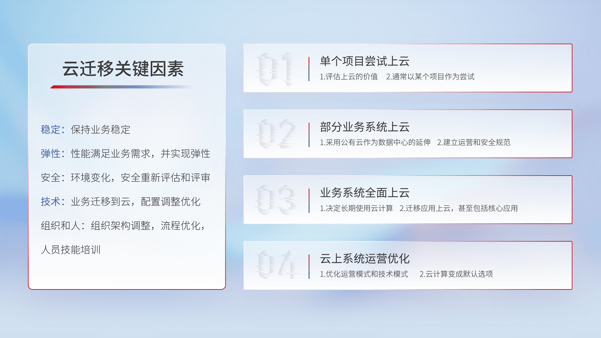 结合实际业务,,,,从规划设计、、、、云平台选型、、、云原生改造、、数据迁移、、、集成交付,,,迁移全过程为客户识别最佳上云路径,,,,做好风险识别管理,,设计网络架构、、、身份权限、、、安全审计合规、、操作审计、、日志审计、、监控告警策略、、、、多站点容灾设计等,,对云上基础设施进行整体规划,,提升IT治理水平,,,,以满足弹性、、、、高可用、、、高性能的需求。。。。
